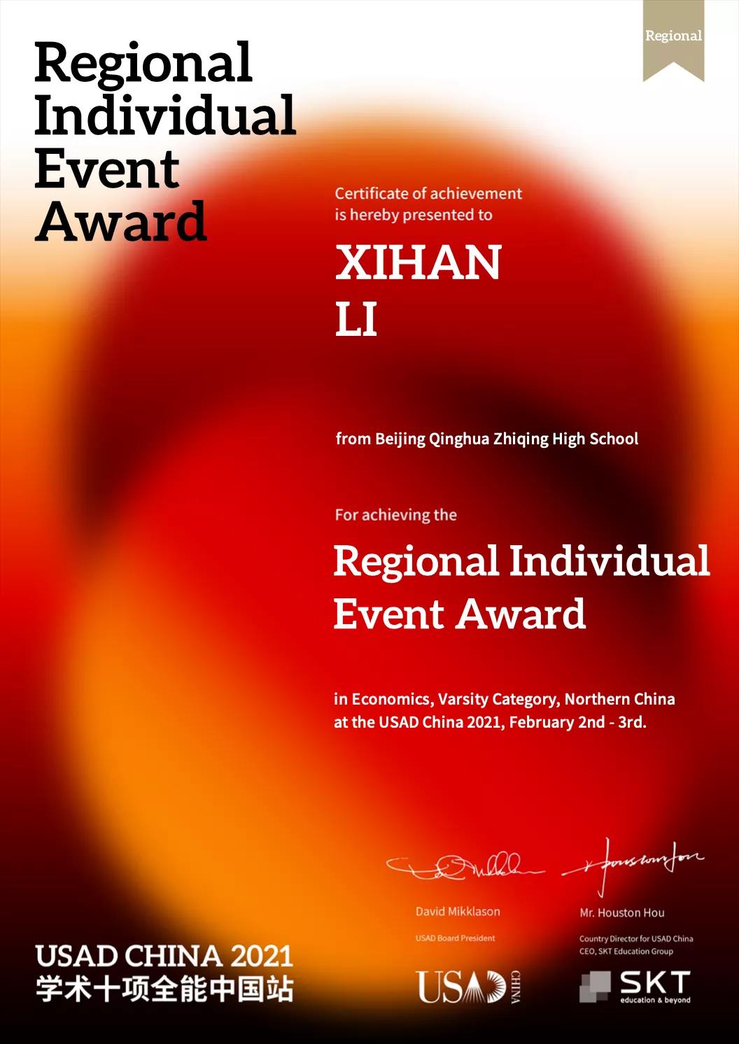祝贺我校李希涵同学在2021年USAD比赛中凭借个人在经济学单科竞赛中的优异表现,获得北方赛区区域个人奖(Regional Individual Event Award in Economics)!