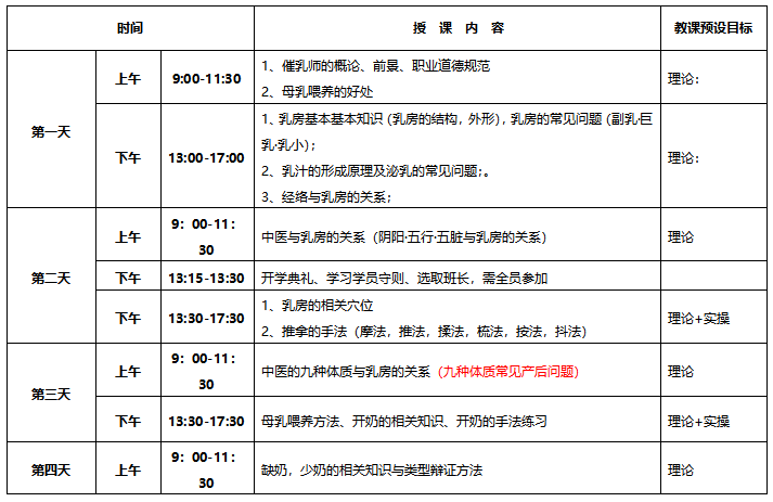 班制:小班制班型:每月30号课时:10天课程亮点:学习中医基础理论,从实际出发了解产妇身体变化,主要讲解催乳和盆骨修复等产妇相关护理问题。适合对象:零基础无学历无限制,只要你想学课