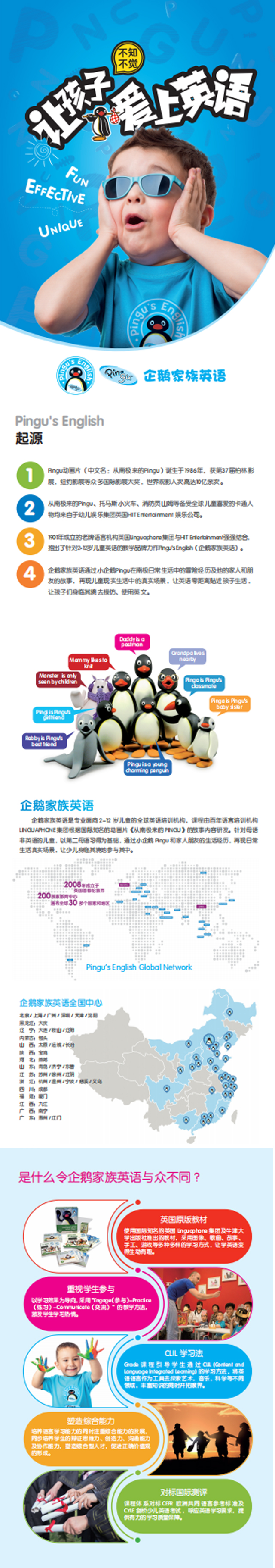 1、企鹅家族英语是专业面向2-8岁儿童的英语培训机构,课程由世界的语言培训机构 Linguaphone集团和使用。