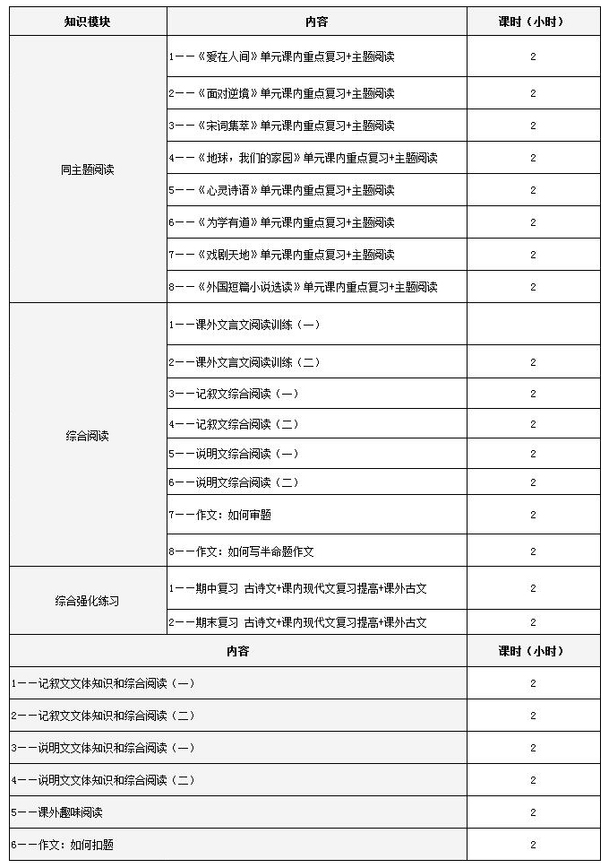上学期教学大纲下学期教学大纲非毕业班:1对3名师班(适合短期有效提高成绩)辅导科目:语文、数学、英语、物理、化学、生物等3个学生基础相近,互动学习,良性竞争老师精力集中,每个孩子都