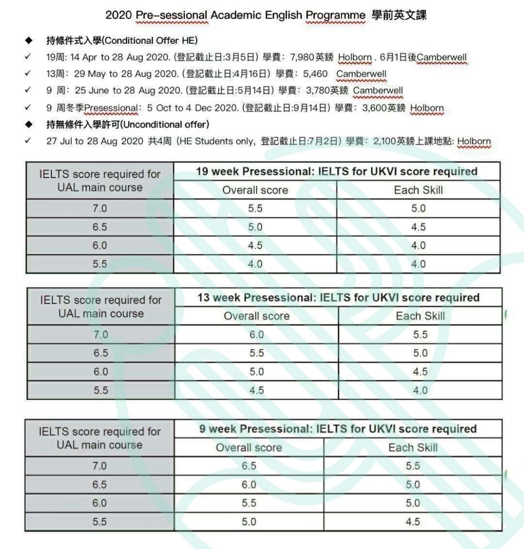 用目前可用的UKVI雅思成绩先申请英国院校语言班。以下是UAL语言班录取要求和截止时间,先到先得录满为止。