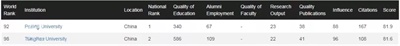 通过对比发现:北*大学的排名由2017年的54位降至2018年的92位,下降了38名;清*大学的排名也由65位下降至98位。几乎就要脱离世界百强大学的行列。