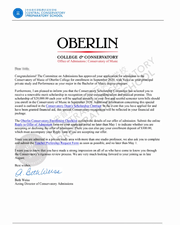 其中包括Eastman School of Music伊斯曼音乐学院、Oberlin Conservatory of Music奥柏林音乐学院、Manhattan School of Music曼哈顿音乐学院、Boston Conservatory at Berklee波士顿音乐学院、Mannes School of Music曼尼斯音乐学院、Royal Birmingham Conservatoire伯明翰皇家音乐学院、Temple University Boyer School of Music天普大学博耶音乐学院、Royal Conservatoire of Scotland苏格兰皇家音乐学院、San Francisco Conservatory of Music旧金山音乐学院、New England Conservatory of Music新英格兰音乐学院、University of Cincinnati College of Arts and Sciences辛辛那提大学文理学院、California State University,northridge 加州州立大学北岭分校、California State University,Los Angeles加州州立大学洛杉矶分校、Queens College Aaron Copland School of Music皇后学院亚伦科普兰音乐学院、Senzoku Gakuen College of Music洗足学园音乐大学等世界知名音乐学院和综合类大学的Offer。