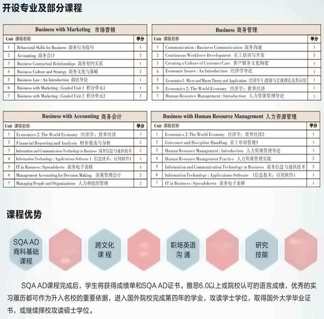 免费在线免费申请名额 国内课程设置SQAAD课程由英国苏格兰学历管理委员会组织英国知名大学、全球一线企业、商科权威组织等设计完成,执行标准化的教学大纲,将全英专业课教材与我校双语教学完美结合,打造最实用、最科学的教学模式,助力学生掌握最相关的专业知识去圆梦海外名校。